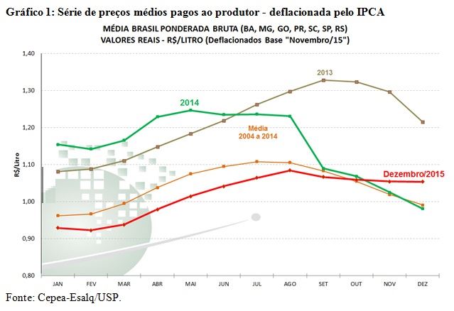 Pesquisadores do Cepea explicam que, enquanto 2014 foi pautado pela “oferta”, que impactou o mercado durante todo o ano passado – a captação de leite em 2014 foi quase 14% maior que em 2013, segundo ICAP-L/Cepea –, em 2015, o fundamento central foi a “demanda”. Devido à crise econômica nacional, o poder de compra do consumidor foi prejudicado e a demanda por derivados lácteos, diretamente afetadas. Com isso, as expectativas de melhora para o setor ficam atreladas à recuperação da economia do País, o que pode não ocorrer no curto prazo.