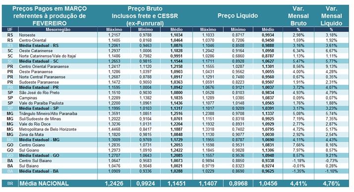 Tabela 1 - Preços pagos pelos laticínios (brutos) e recebidos pelos produtores (líquido) em MARÇO/16 referentes ao leite entregue em FEVEREIRO/16.