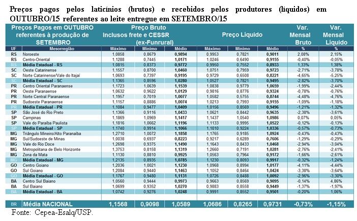 Segundo Valter Galan, do MilkPoint Inteligência, “o consumo de derivados lácteos segue fraco, devido à atual situação econômica. No entanto, os problemas climáticos - excesso de chuvas no Sul e falta de chuvas em Minas Gerais e Goiás - fizeram com que o crescimento da oferta em outubro fosse menor que o esperado, limitando a queda no preço pago ao produtor”.