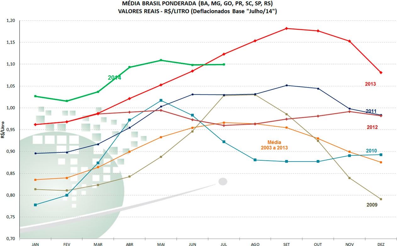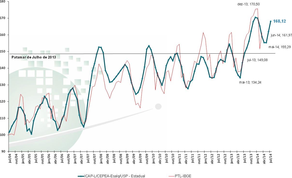 Gráfico 1: ICAP-L/Cepea - Índice de Captação de Leite – JULHO/14. (Base 100=Junho/2004)