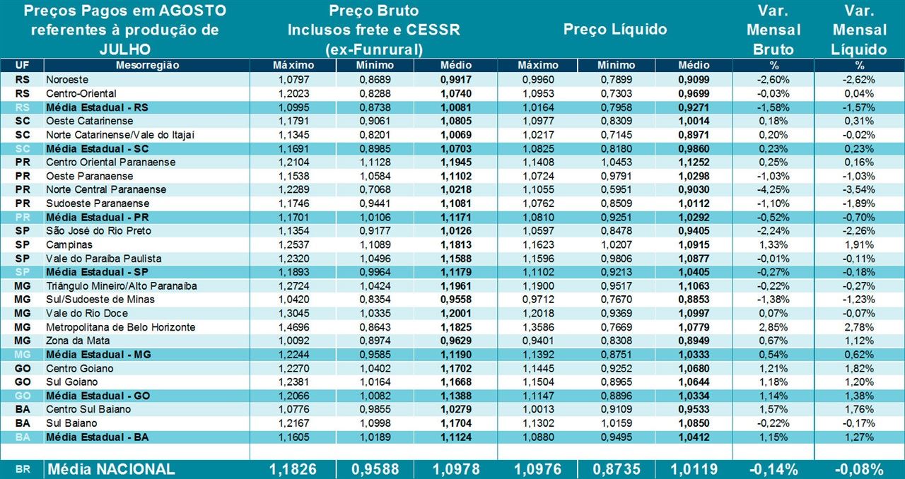 Tabela 1. Preços pagos pelos laticínios (brutos) e recebidos pelos produtores (líquidos) em AGOSTO referentes ao leite entregue em JULHO