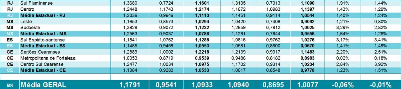 Tabela 2. Preços em estados que não estão incluídos na “média nacional” – RJ, MS, ES e CE