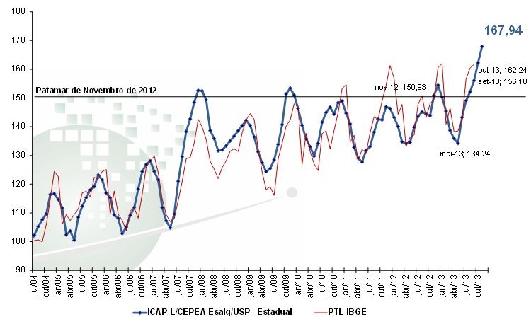 Gráfico 1: ICAP-L/Cepea - Índice de Captação de Leite - NOVEMBRO/13. (Base 100=Junho/2004)