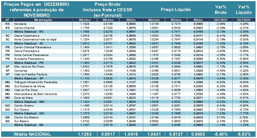 Em dezembro, o preço médio bruto nacional (“média Brasil”) pago ao produtor (que inclui frete e impostos) foi de R$ 1,0416/litro, forte redução de 5,4% (ou de 5,9 centavos) em relação a novembro. O preço líquido médio (sem frete e impostos) caiu 5,8%, passando para R$ 0,9602/litro. Estas médias, calculadas pelo Cepea, são ponderadas pelo volume captado em outubro nos estados de GO, MG, PR, RS, SC, SP e BA.