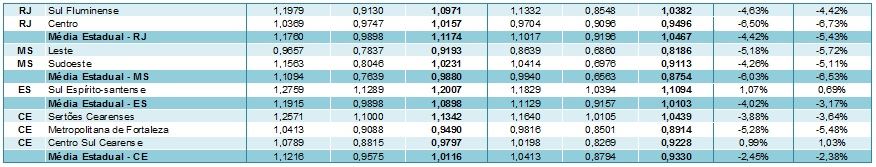 Tabela 2. Preços em estados que não estão incluídos na “média nacional” – RJ, MS, ES e CE