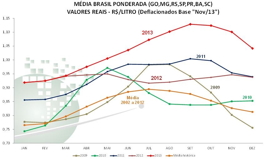Apesar das quedas de preços, os patamares continuam elevados se comparados aos do ano passado. A média de dezembro/13 supera em 11,09% a de dez/12, de R$ 0,9376/l, em termos reais. Se considerado todo o ano passado, quando o preço médio foi de R$ 0,9332/l, a valorização é de 10,48% - a média de 2013 é de R$ 1,0310/l.