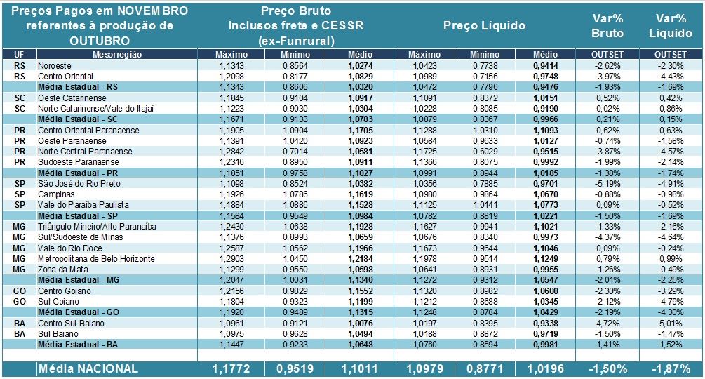 Tabela 1. Preços pagos pelos laticínios (brutos) e recebidos pelos produtores (líquidos) em NOVEMBRO referentes ao leite entregue em OUTUBRO