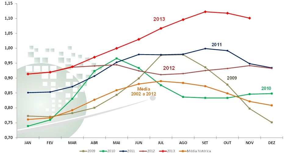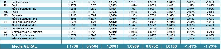 Quanto aos estados que não compõem a “média Brasil”, houve queda de 2,07% no Rio de Janeiro e 0,33% no Espírito Santo. Já em Mato Grosso do Sul e no Ceará, os aumentos foram de 2,04% e 0,35%, respectivamente.