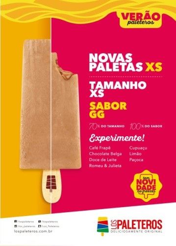 Disponível nas opções Doce de Leite, Café Frapê, Romeu & Julieta, Paçoca, Chocolate Belga, Limão e Cupuaçu, as paletas XS são feitas com os mesmos padrões de qualidade e referência da Los Paleteros, como o recheio abundante, sabores inovadores, ingredientes selecionados e uma experiência de consumo incrível.