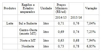Os preços mínimos estabelecidos para o leite foram os seguintes: para a s regiões Sul e Sudeste, R$0,76/litro; para o Centro-Oeste (exceto MT), R$0,74/litro; para o Norte e MT, R$0,68; para o Nordeste, R$0,78.