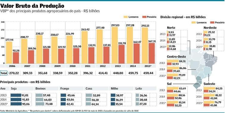 Conforme a Confederação da Agricultura e Pecuária do Brasil (CNA), que ontem também atualizou seus números, o VBP da agropecuária brasileira crescerá 3,4% em 2015, para o recorde de R$ 467,5 bilhões. A entidade passou a prever o VBP da agricultura em R$ 292 bilhões, 3,6% maior, e o da pecuária em R$ 175,3 bilhões, um aumento de 3,1% na comparação.