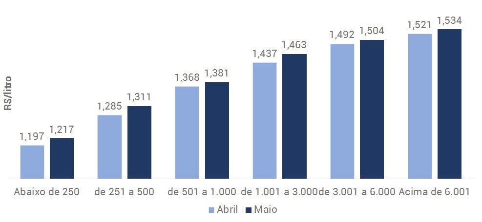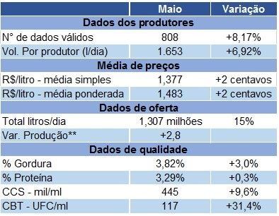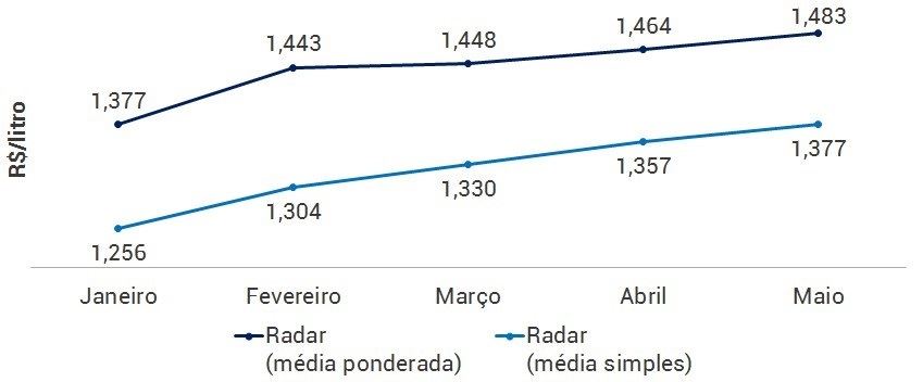 A média simples do preço (ou seja, sem considerar o volume dos produtores) foi de R$ 1,377/litro e a ponderada pelo volume, por sua vez, fechou em R$ 1,483/litro, ambas 2 centavos mais altas do que o valor divulgado em abril.