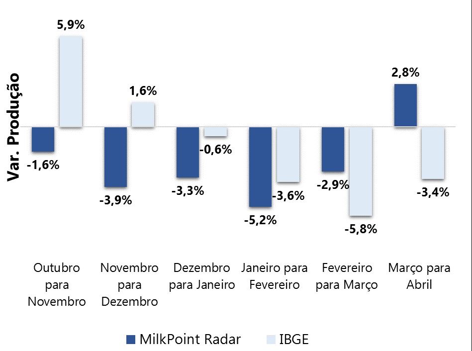 Gráfico 3. Variação de oferta entre os meses – IBGE e MilkPoint Radar.