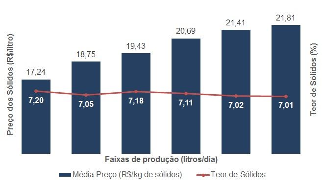 É importante observar o impacto da produção diária de cada participante no resultados destes indicadores. Podemos observar no gráfico 4 que, quanto ao teor de sólidos, há pouca diferença entre o resultado dos produtores com maior produção diária em relação aos de menor volume - a diferença entre o maior resultado (7,20%) e o menor resultado (7,01%) é de apenas 3%. Em compensação, o indicador de preço por kg de sólidos segue uma tendência clara: quanto maior a produção diária, maior a remuneração pelos sólidos - a diferença entre o maior resultado (R$ 21,81/kg de sólidos) e o menor resultado (R$ 17,24/kg de sólidos) é de 26,5%.