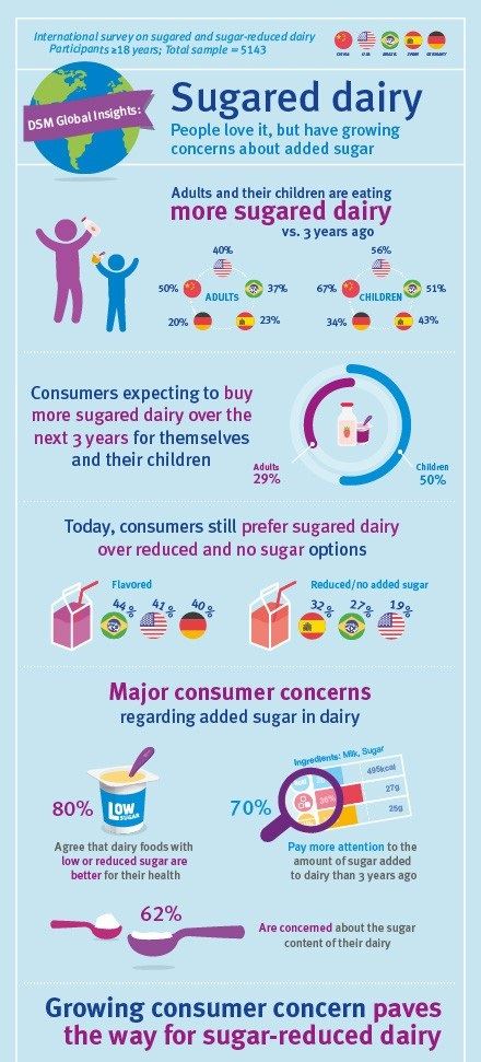 A DSM revelou a atitude de consumidores de lácteos com açúcar. Por meio de uma pesquisa internacional realizada entre 5.000 adultos de cinco países, concluiu-se que houve um aumento no consumo de produtos lácteos com açúcar entre os adultos e seus filhos, de 34% e 53% respectivamente. A pesquisa também revelou que os consumidores que participaram da pesquisa esperam continuar consumindo esses produtos nos próximos três anos, apesar do aumento das preocupações com relação à adição de açúcar na dieta.