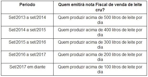 Sendo assim, garantimos novos prazos para esta adequação. No novo Decreto, que será publicado nos próximos dias, apenas os produtores que produzam acima de 500 litros de leite por dia terão a responsabilidade de emitir nota fiscal de venda de leite cru à indústria de laticínios todo mês.