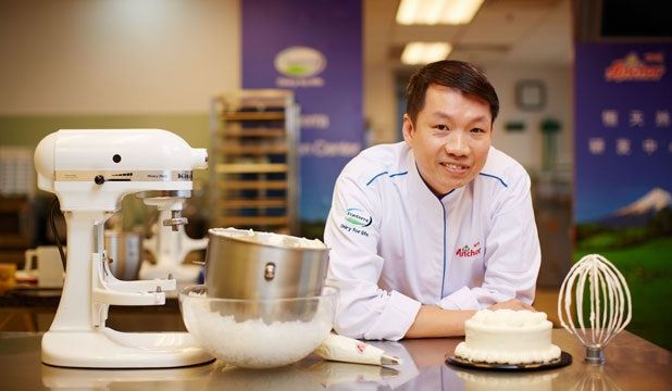 O chef da Fonterra, Teoh Joo Chong, na cozinha da companhia em Xangai, onde ensina cozinheiros locais sobre como usar os produtos lácteos