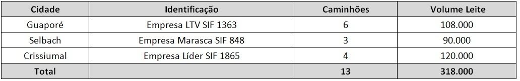 3. Todo o leite cru foi encaminhado ao SIF 355, em Taquara. Para tanto foram utilizados 13 caminhões que transportaram cerca de 318.000 litros de leite. Dados abaixo.