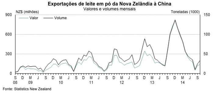 “As exportações de leite em pó à China caíram após preços e quantidades recordes alcançados no final de 2013, contribuindo para a queda de 40% nas exportações à China”, disse o gerente de estatísticas internacionais do Statistics New Zealand, Jason Attewell.