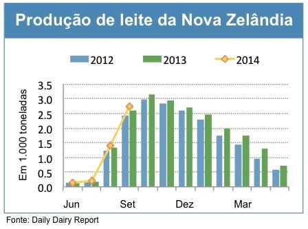 Atualmente, as boas condições de pastagens em toda a Nova Zelândia, mais vacas e suplementação nutricional contribuíram para um ganho de produção de leite em setembro com relação ao ano anterior de quase 5%. Os números de vacas da Nova Zelândia estão estimados em 5,1 milhões de cabeças, 87.000 cabeças a mais que no ano anterior. De acordo com o relatório GAIN, cerca de 100 fazendas leiteiras surgiram em agosto de 2014 como resultado das conversões de fazendas de produção agrícola, fazendas de criação de bovinos de corte/ovinos, e terras florestais. As importações de extrato de palma, usado como suplemento alimentar de vacas leiteiras, estão 39% acima do ano anterior. É provável que o forte pagamento do leite no ano passado tenha sido usado em parte para comprar esses suplementos alimentícios.