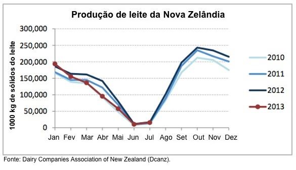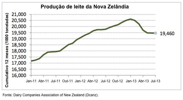 A produção cumulativa para os primeiros dois meses do ano produtivo de 2013-14 (junho e julho) caiu em 5,8%. A Nova Zelândia previu que a produção total de leite em 2013-14 será 5% maior que em 2012-13, devido à melhora nas condições climáticas após a seca registrada no início de 2013.