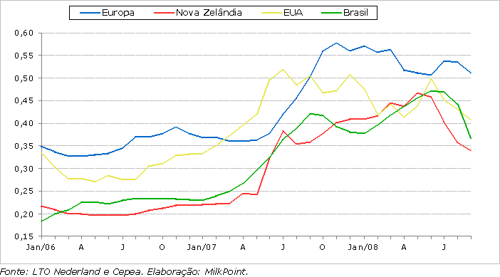 Comparado ao mesmo mês do ano anterior (setembro/2007), somente a Europa apresentou variação positiva nos preços, com alta de 1,29%. EUA e Nova Zelândia permanecem com preços em queda, com variação negativa de 19,6% nos EUA e 5,8% na Nova Zelândia.