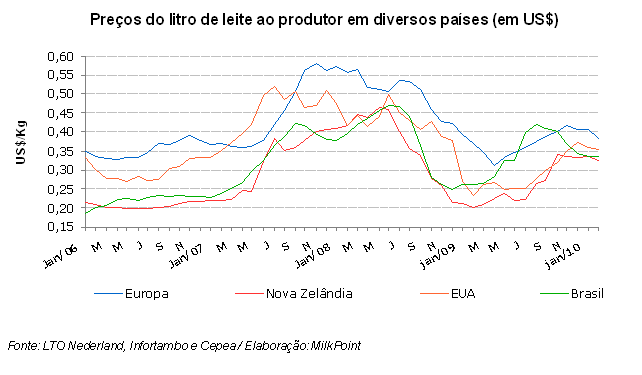 Analisando o gráfico 1, observa-se que em fevereiro de 2010 os preços do leite na Nova Zelândia, em dólar, recuaram 3,9% (de US$ 0,3368/kg para US$ 0,3235/kg - valor considerando leite contendo 8,3% de gordura + proteína), comparados a janeiro. Na Europa, os preços, em dólar, apresentaram a maior queda entre as três comparações, com redução de 5,8%, de US$ 0,4069/kg no mês de janeiro para US$ 0,3832/kg em fevereiro. Nos Estados Unidos, houve queda de 1,5% em comparação ao mês anterior (de US$ 0,3582/kg para US$ 0,3530/kg).