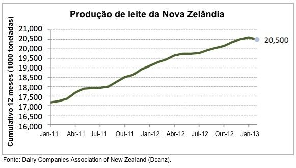 A produção de leite da Nova Zelândia no mês de fevereiro foi de 1.763.000 toneladas, 23% a menos que em janeiro, mas apenas 6% inferior à de fevereiro de 2012. Pessoas que visitaram as regiões leiteiras do centro da Ilha do Norte previram declínios muito maiores, mas a crescente produção na Ilha do Sul amenizou a queda. Contudo, a produção de fevereiro de 2013 ainda está 4,8% maior do que em janeiro de 2011.
