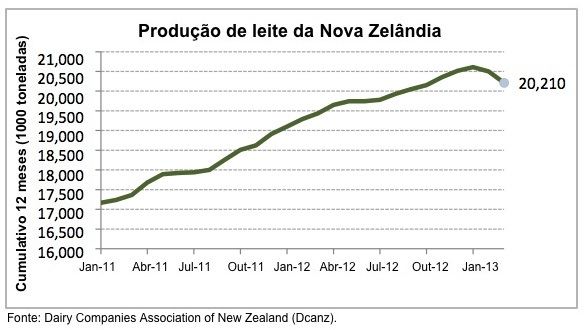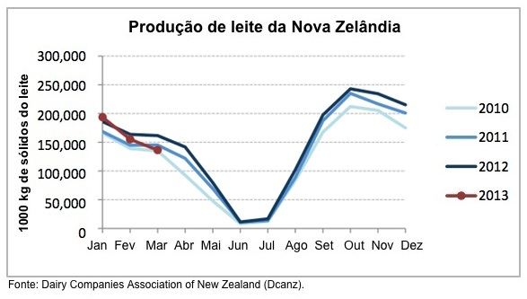 Somente 1,446 milhão de toneladas de leite foram produzidas no mês de março, 18% a menos que em fevereiro e 17% a menos que em março de 2012. Considerando a escala e a severidade da seca, muitos podem ter esperado quedas ainda maiores, mas a manutenção dos volumes produzidos na Ilha do Sul – mesmo afetada pela seca – limitaram os danos.