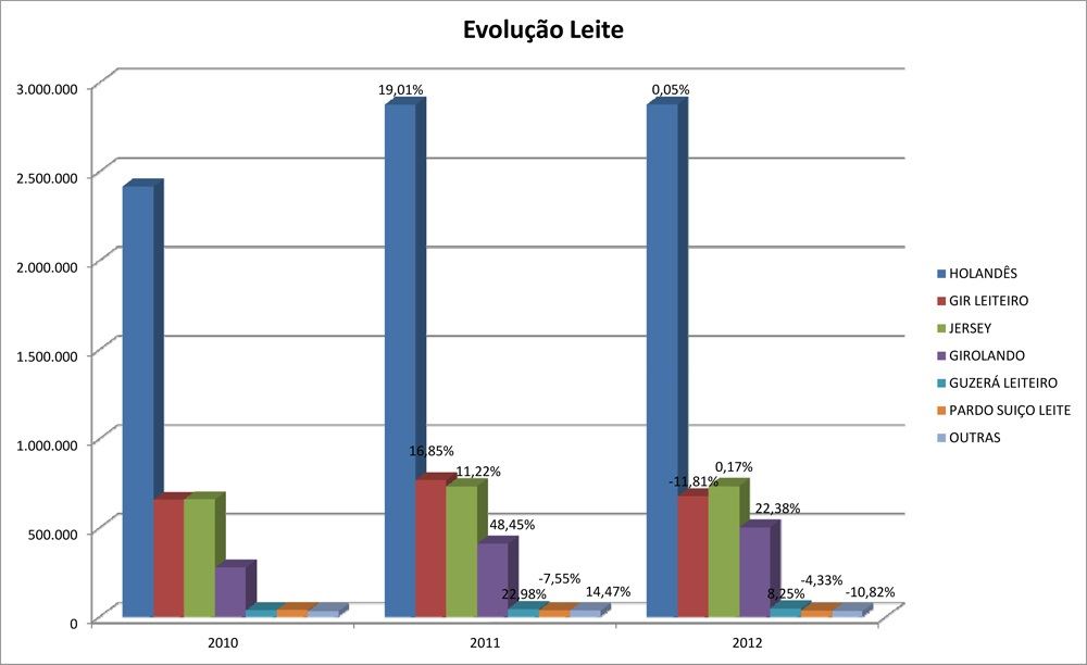 No rebanho bovino leiteiro, a comercialização sêmen de Girolando foi o que mais cresceu (22,38%), seguido pelo Guzerá Leiteiro (8,25%) e Jersey (0,17%). Enquanto as vendas de sêmen Holandês cresceram apenas 0,05% em 2012, as demais raças, como Gir Leiteiro, Pardo Suíço Leiteiro, entre outras, apresentaram queda quando comparados com o ano de 2011. Estas informações podem ser visualizadas no gráfico abaixo.