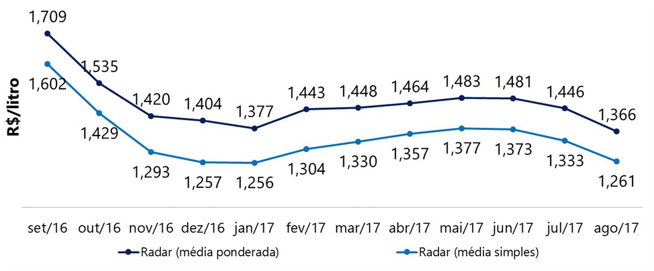 Enquanto que em 2015 e 2016 a produção caiu, respectivamente, 2,8% e 3,7% (depois de 20 anos de crescimento ininterrupto!), os números preliminares deste ano mostram um aumento significativo dos volumes produzidos. Este aumento da oferta pode ser observado pela evolução dos volumes de produção dos participantes do MilkPoint Radar, aplicativo gratuito de compartilhamento de informações entre produtores de leite e consultores.