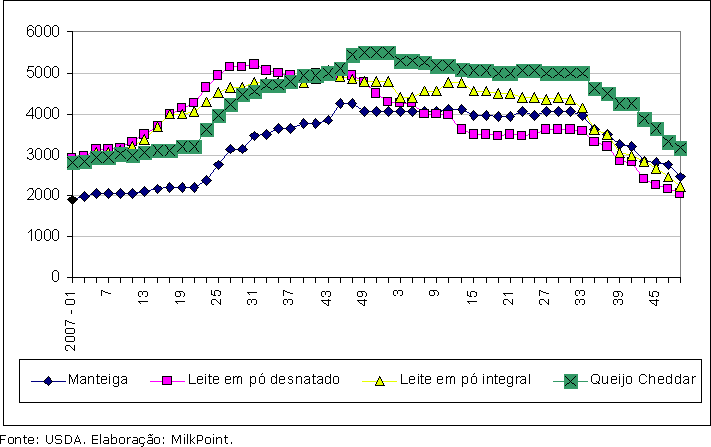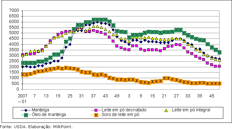 Gráfico 1. Evolução dos preços de exportação de lácteos do Oeste da Europa, em dólares por tonelada.