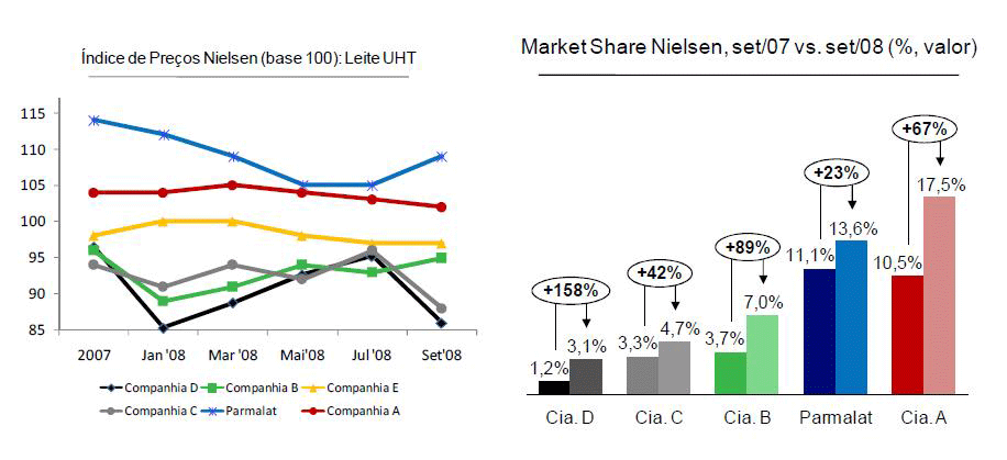 ser de feroz concorrência, com a entrada de grandes grupos empresariais e com a injeção de recursos por parte de bancos oficiais em algumas empresas de médio porte. O resultado imediato foi a alta no preço do leite cru e a baixa no preço do produto industrializado. Todas as empresas do setor se fragilizaram e perderam dinheiro, pois operaram por períodos a fio com margens negativas, como se apura pela leitura de seus respectivos balanços e nas matérias publicadas na imprensa. O preço do leite no mercado internacional que em 2007 atingiu o pico de US$5,500.00/ton caiu para US$2,200.00/ton em 2008.