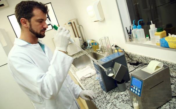 Luiz Carlos Roma Junior, pesquisador, faz análise de leite no laboratório