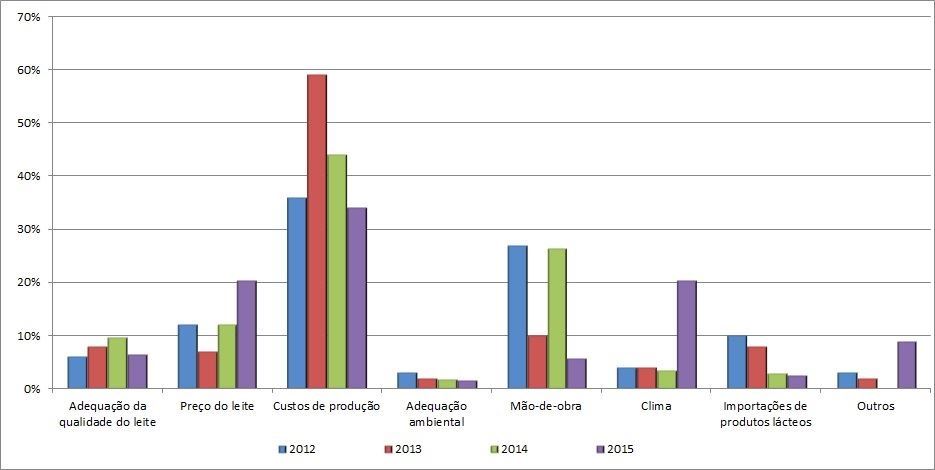 Em 2015, com 34,1% dos votos, o custo de produção foi apontado como o item de maior preocupação para o setor (assim como as pesquisas anteriores). As opções preço do leite e clima subiram significativamente em porcentagem e posição, ficando empatadas no segundo lugar. A adequação da qualidade do leite se manteve como o 4º maior desafio, ao passo que a mão-de-obra, que em 2014 ocupou o segundo lugar, em 2015 ficou apenas como a 5º preocupação do setor.