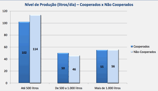 Em relação ao perfil dos respondentes (figura 1), houve bom equilíbrio entre produtores cooperados e não cooperados (207 x 216, respectivamente), bem como em relação ao porte - 216 produtores com produção abaixo de 500 litros e 197 com produção acima de 500 litros.