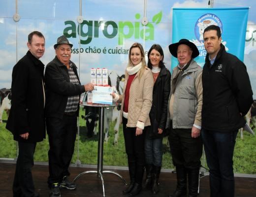 Da esquerda para a direita: o presidente da Cooperativa Piá, Gilberto Kny, o presidente da Associação de Saúde de Feliz – ASAF, Orestes Gabardo, a diretora administrativa da ASAF, Renata Herzer Ludwig, a diretora técnica da ASAF, Jacqueline Kops Simon, o vice-presidente da Cooperativa Piá e coordenador geral do Rural Show, Nilson Olbermann, e o representante técnico de Vendas da Bayer Saúde Animal, Júlio Cesar Martino. Créditos: João Verno Stoffel