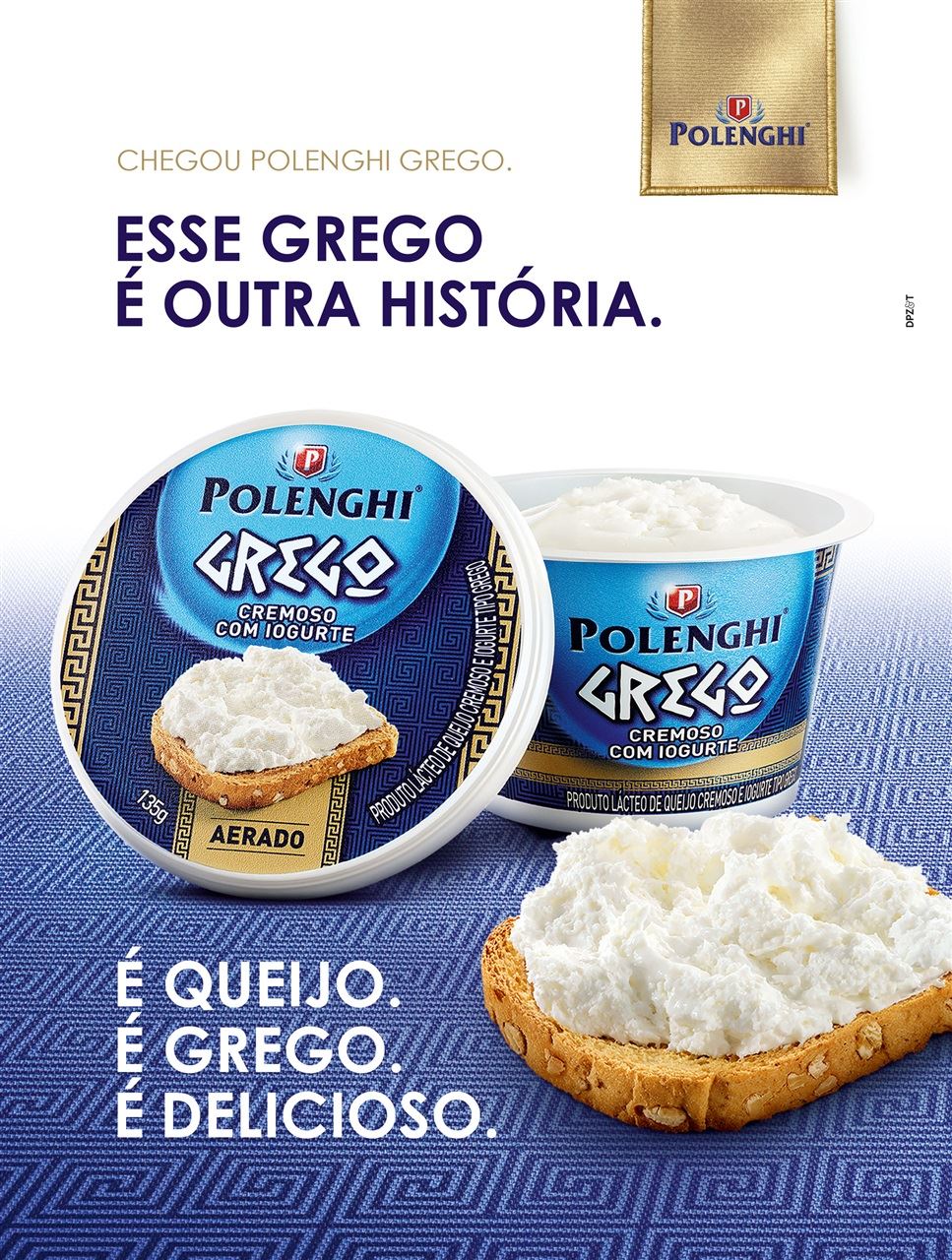 Polenghi GREGO é leve, consistente e cremoso, possuindo uma exclusiva textura aerada. Desenvolvido a partir da suave acidez do iogurte grego com o queijo cremoso Polenghi, o produto pode substituir os tradicionais Cream Cheese, requeijão e manteiga. Diferente e muito versátil, o Grego da Polenghi pode ser consumido com pães e sanduíches, frutas secas, geleias e como ingrediente culinário. Além disso, ele é uma ótima fonte de proteína com teor 50% maior que o Cream Cheese Tradicional.