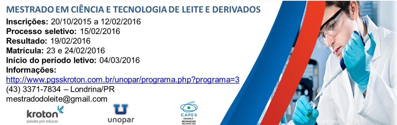 Estão abertas até o dia 12/02/16 as inscrições do processo seletivo para a 11ª turma do Mestrado em Ciência e Tecnologia de Leite e Derivados da UNOPAR, em Londrina-PR. O curso é recomendado pela CAPES, tem duração de 2 anos e visa capacitar profissionais de nível superior para atividades de ensino, pesquisa e inovação tecnológica. O curso possui laboratórios próprios, com equipamentos específicos para o desenvolvimento de pesquisas com foco em: composição e qualidade do leite, propriedades e aplicações dos constituintes do soro de queijo e leitelho e, também, em tecnologia de leite e produtos lácteos.