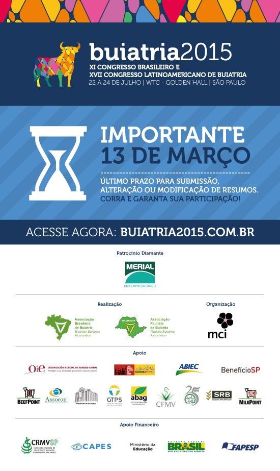 Na última semana de julho de 2015 será realizado, em São Paulo (Brasil), o XVII Congresso Latino-americano de Buiatria e o XI Congresso Brasileiro de Buiatria. O tema será: Um mundo, uma saúde.
