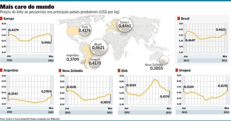 Compilação de preços elaborada pelo Milkpoint, consultoria especializada em lácteos, mostra que, em março passado, o produtor brasileiro recebeu US$ 0,4621 pelo quilo do leite, mais do que todos os outros grandes produtores, como Nova Zelândia, Estados Unidos, Argentina, Uruguai e Europa (ver gráfico abaixo). Os dados do Brasil são do Cepea e os demais foram levantados pela consultoria italiana CLAL, especializada em mercado de lácteos.