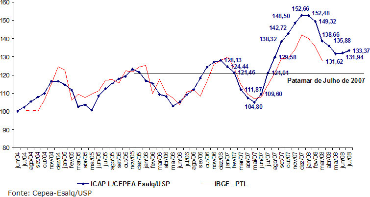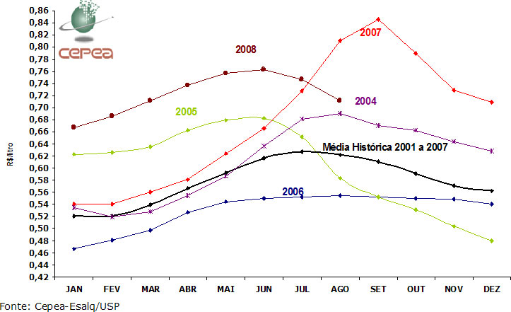 Comparando o Icap/Cepea de julho deste ano ao de 2007, constata-se que a produção está 10,2% maior. Esta é a menor diferença dos últimos 13 meses. Em abril, chegou a ser de 27% e, em junho, de 20%.