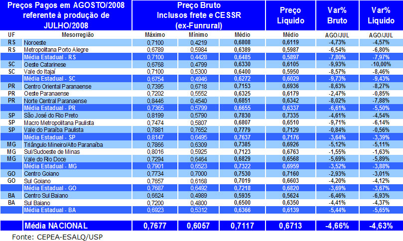 Tabela 1. Preços pagos pelos laticínios (brutos) e recebidos pelos produtores (líquidos) em AGOSTO de 2008, referente ao leite entregue em JULHO.