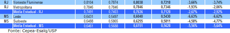 Tabela 2. Médias estaduais das novas regiões - RJ e MS.