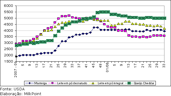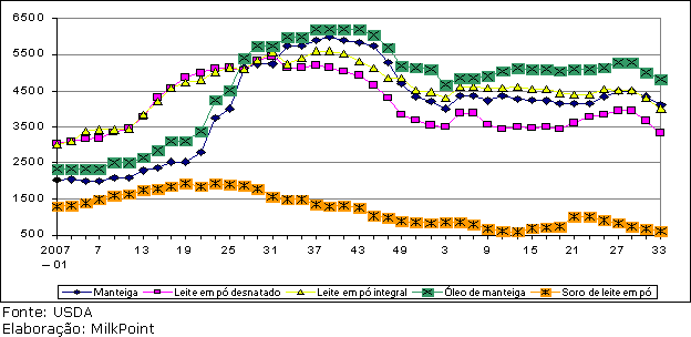 Os valores médios da manteiga foram de US$ 3.950/t na Oceania, queda de 2,5% em relação à quinzena anterior, e US$ 4.100/t no Oeste da Europa, queda de 5,5%.