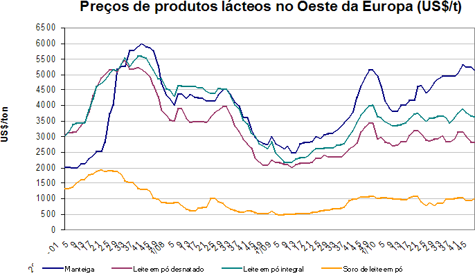 Gráfico 1. Evolução dos preços de exportação de lácteos do Oeste da Europa, em dólares por tonelada.