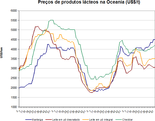 A produção de leite na Oceania está no seu pico. A oferta está nos níveis esperados por produtores e processadores e a tendência é que se mantenha nesse patamar por um período. Na Nova Zelândia, a safra desse ano começou forte, depois sofreu um pouco em razão de adversidades climáticas, e agora têm sido observados novos aumentos. Assim que as condições climáticas melhoraram, o volume de leite apresentou alta, porém, ainda abaixo da previsão.