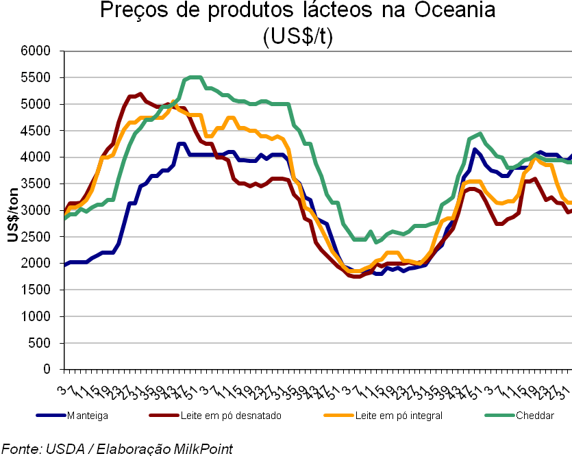 Tem sido reportado aumentos na produção de leite na Noza Zelândia. Processadores indicam que apesar de não tratar de aumentos significativos, eles são perceptíveis. Na Austrália, o começo de uma nova safra está ainda com algumas semanas de atraso. Em razão da manutenção de baixas temperaturas do inverno e seca, a oferta de forragem segue reduzida. A Austrália divulgou recentemente sua produção de leite da safra 2009/2010, apontando queda de 3,9% frente a safra 2008/2009.