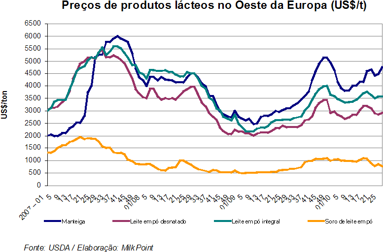 A estação de produção de leite da Europa está em período de baixa. Processadores de leite afirmam que apesar da produção ter iniciado de forma lenta, os volumes produzidos já estão alcançando os valores do ano anterior, e indicam que a mesma deva ser superior à safra 2009/2010.