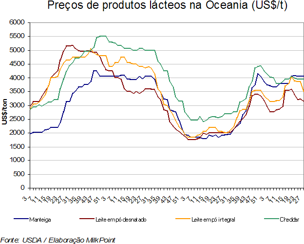 Na Oceania, a discussão girou em torno do último Leilão da Fonterra. A maioria dos comerciantes e processadores previam uma tendência de baixa; porém, a queda acentuada foi uma surpresa para muitos. Os agentes do mercado acreditam ser ainda demasiado cedo para perceber qual o impacto que essa significativa queda terá sobre o mercado, porém explicam que por tratar-se de um leilão, nos quais acentuadas variações podem ocorrer positivamente ou negativamente, não deve ocorrer um impacto significativo. A expectativa no mercado é de que em setembro, quando a Fonterra passará a realizar dois leilões por mês, haja redução da volatilidade dos preços.